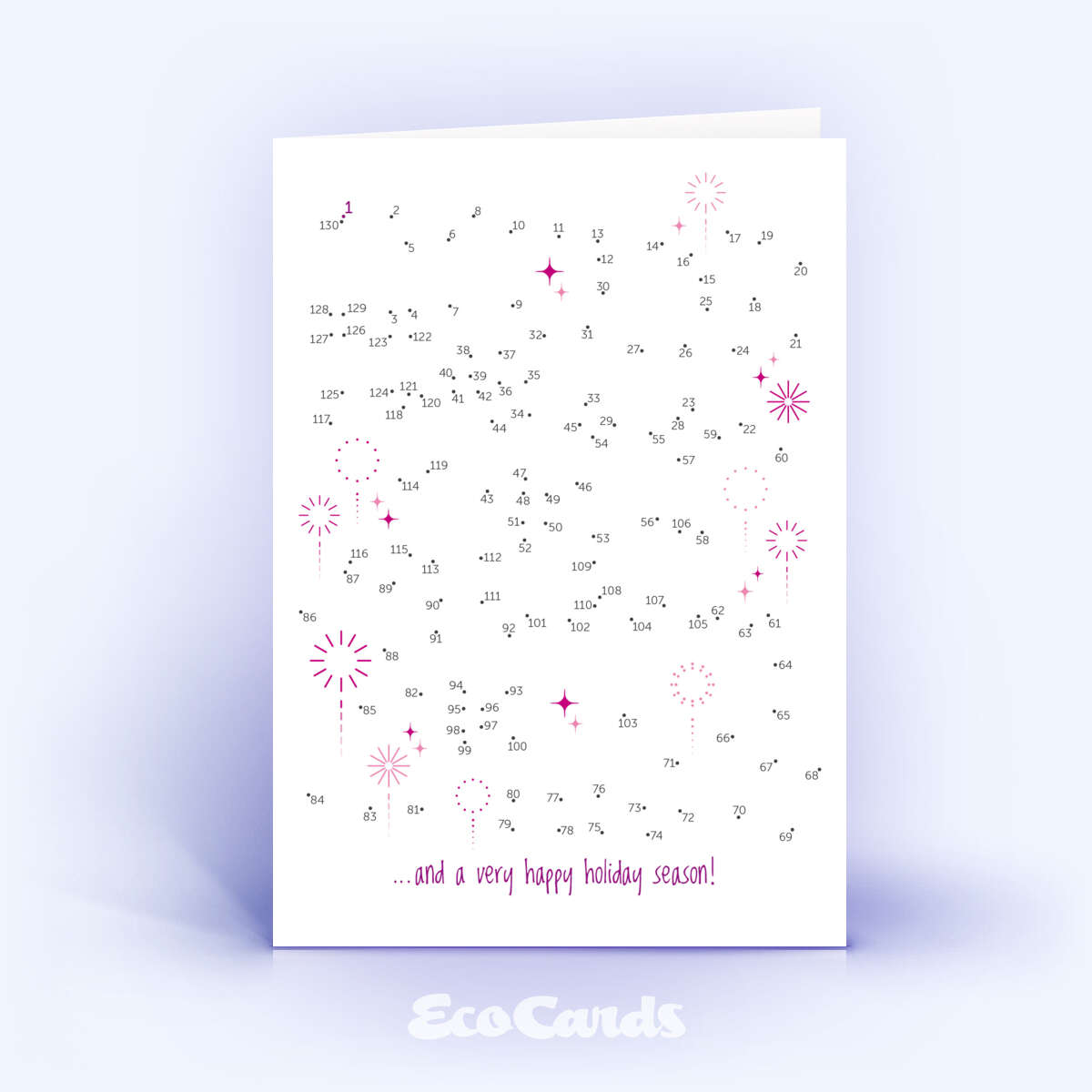 Diese besondere Neujahrskarte in Pink verbindet einen englischen Neujahrsgruß mit einer kleinen, originellen Überraschung. Wenn Sie alle 130 Punkte verbinden, wird nach und nach der englische Neujahrsgruß „Happy New Year” sichtbar. Jetzt Auflösung entdecken und weitere Weihnachtskarten mit Rätsel ansehen – alle Designs inklusive Lösungen finden Sie hier.
